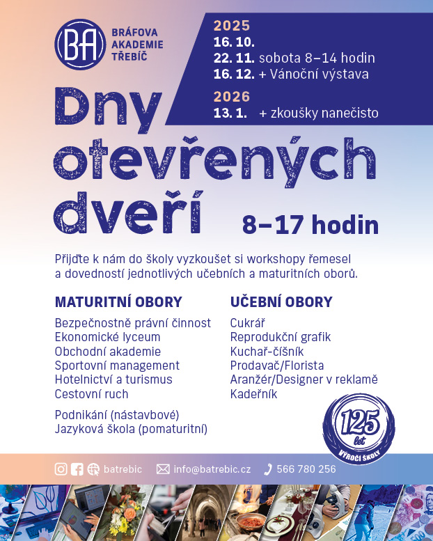 Den otevřených dveří SOBOTA 22. 11. 2025 od 8 do 14 hodin. Přijďte se podívat a informovat na možnosti studia na naší škole.